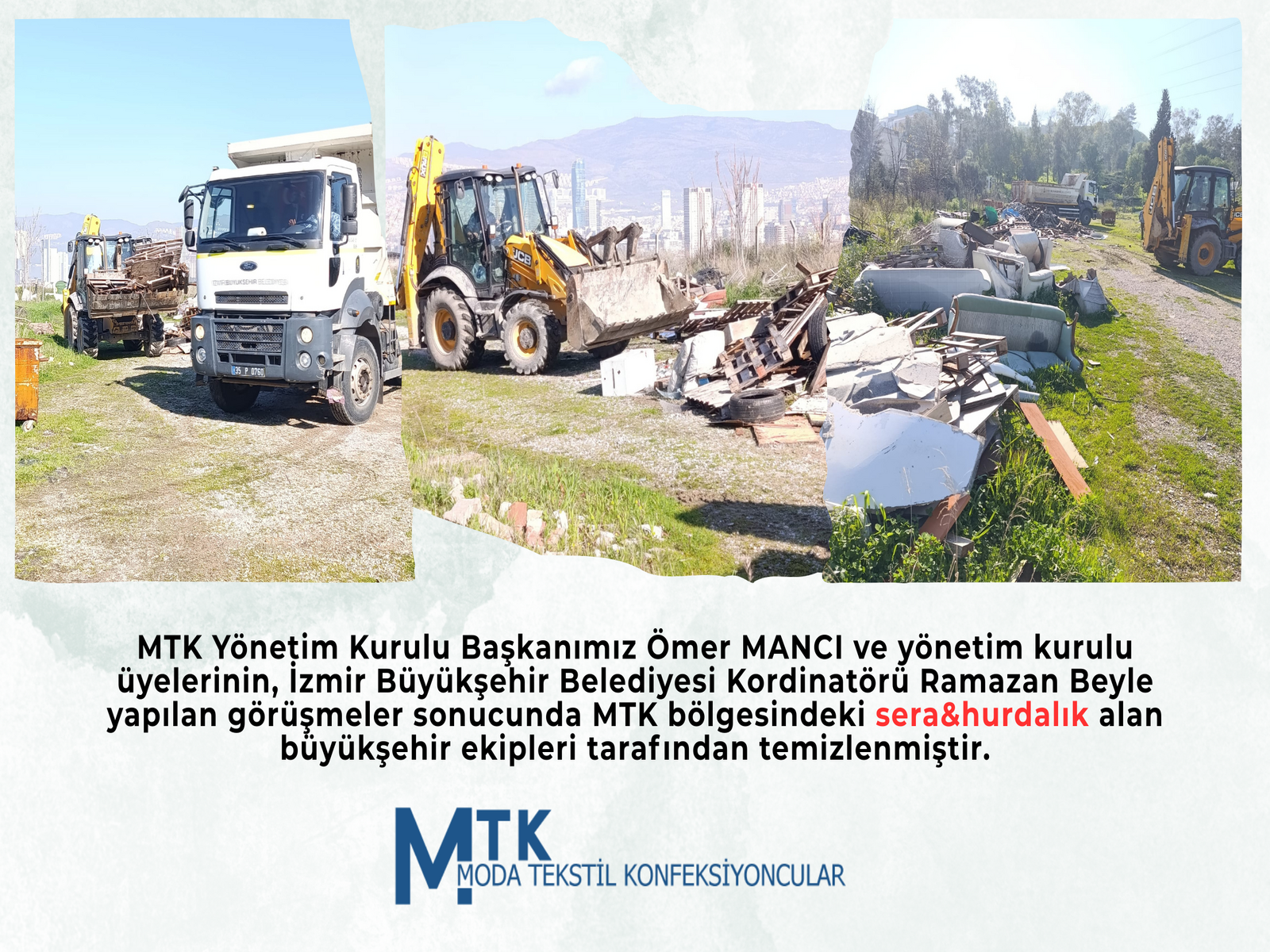 MTK Yönetim Kurulu Başkanımız Ömer MANCI ve yönetim kurulu üyelerinin, İzmir Büyükşehir Belediyesi Kordinatörü Ramazan Beyle yapılan görüşmeler sonucunda MTK bölgesindeki sera&hurdalık alan büyükşehir ekipleri tarafından temizlenmiştir.